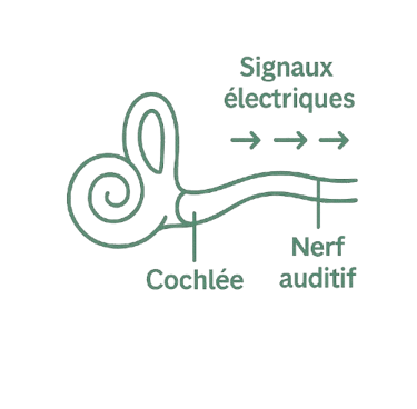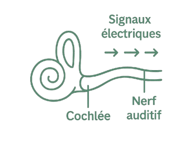 où ces vibrations sont converties en signaux électriques par la cochlée, avant d’être envoyées au cerveau via le nerf auditif.
